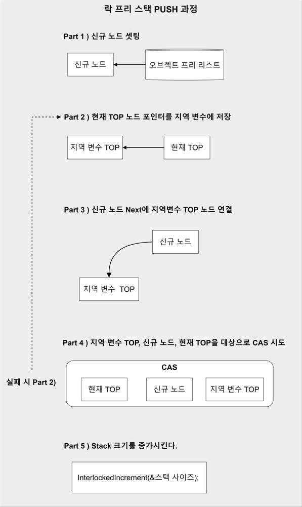 LockFree Stack은 LockFree Algorithm을 기반으로한 멀티 쓰레드 환경에서 사용할 수 있는 Stack Container 입니다. LockFree Stack은 기본적으로 Push와 Pop 메서드를 가지고 있습니다.